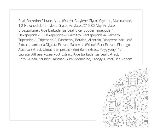 Esencja ma w swoim składzie bogatą formułę wyłącznie naturalnych, aktywnych składników. Esencja wygładza i ujędrnia skórę, a jednoczenie zapewnia jej intensywne odżywienie oraz nawilżenie. Skutecznie wspomaga regenerację problematycznej skóry z podrażnieniami oraz poprawia jej koloryt. Esencja w 90 % składa się z ekstraktu ze śluzu ślimaka oraz jadu pszczelego. Śluz ślimaka wpływa korzystnie na naturalną regenerację komórek, nawilża skórę oraz znacząco poprawia jej elastyczność. Jad pszczeli natomiast zwiększa krążenie krwi oraz produkcję kolagenu i elastyny, dzięki czemu skóra staje się wygładzona oraz bardziej jędrna. Emulsja w widoczny sposób odmładza wygląd skóry oraz zapewnia jej odpowiednie nawodnienie przez cały dzień. Skóra staje się sprężysta, bardziej rozświetlona oraz intensywnie odżywiona i nawilżona. Regularne stosowanie emulsji korzystnie wpływa na kondycję skóry.