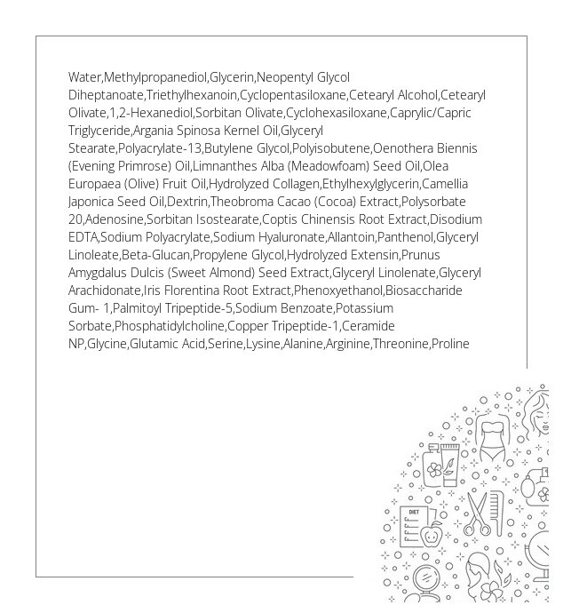 Przeciwzmarszczkowy krem zawiera 54% kolagenu morskiego i działa liftingująco, odżywia, wygładza zmarszczki, zmiękcza napiętą, suchą skórę, poprawia syntezę kolagenu i elastyny ​​w naskórku, przywraca skórze elastyczność i młody wygląd. Krem o gęstej konsystencji i bogatych składnikach doskonale nadaje się do cery wyjątkowo suchej oraz z oznakami starzenia. Mizon Collagen Power Firming Enriched Cream zawiera również adenozynę, silny składnik przeciwstarzeniowy, który aktywnie wygładza zmarszczki mimiczne na czole, fałdy nosowo-wargowe, w kącikach oczu i ust. Kolagen morski jest najbliższy molekularnie ludzkiej skórze, dzięki czemu wnika w głąb naskórka, łatwo się wchłania i pomaga odbudować macierz pozakomórkową, przywraca elastyczność skóry, wzmacnia i wygładza skórę.