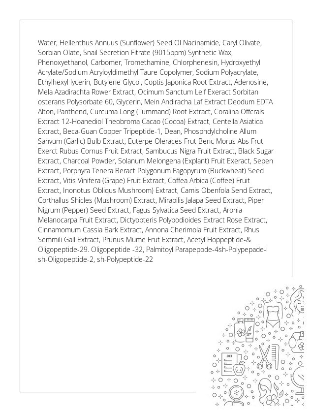 Krem do twarzy z mucyną czarnego ślimaka to wielofunkcyjny produkt o intensywnym działaniu leczniczym, przeciwbakteryjnym, łagodzącym i nawilżającym. Oprócz wysoce skoncentrowanej mucyny ślimaka, krem wzbogacony jest o 20 różnych ekstraktów roślinnych, adenozyny, peptydu i niacynamidu, dzięki temu zapewnia olbrzymie korzyści pielęgnacyjne dla wielu problemów skórnych. Krem ma elastyczną konsystencję i błyskawicznie się wchłania oraz nie pozostawia uczucia lepkości. Aktywizuje syntezę kolagenu co wpływa na zwiększenie funkcji ochronnych naskórka.
