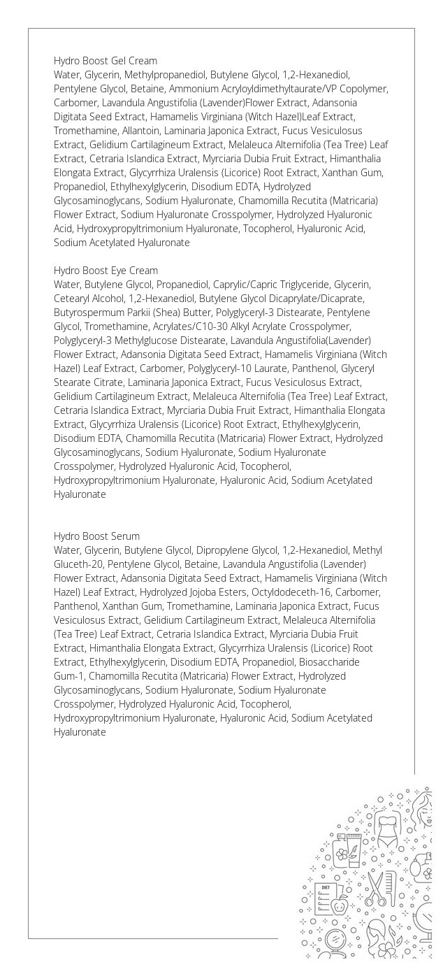 Hydro Boost Serum (50ml): Skoncentrowane serum, które głęboko nawilża, regeneruje i wzmacnia barierę ochronną skóry, dzięki zaawansowanemu kompleksowi kwasów hialuronowych oraz ekstraktom z alg morskich i roślin.