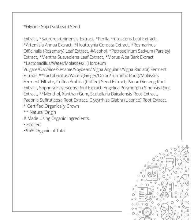 Tonik oparty jest na ponad 20 cennych naturalnych ekstraktach i olejkach pochodzenia organicznego, ukierunkowanych na intensywne odżywienie i stymulację wzrostu włosów. Probiotyk z korzenia imbiru, kurkumy, sezamu i nasion zwiększają skuteczność toniku, pobudzają krążenie krwi i ułatwiają przenikanie środka do głębszych warstw skóry, wzmacniając w ten sposób jego działanie. Dzięki bazie ekstraktów z rozmarynu, nasion glicyny sojowej, piołunu, liści perilli, tonik aktywnie zapobiega wypadaniu włosów oraz wzmacnia cebulki włosów, nawilża oraz zapobiega wysuszaniu się włosów. Organiczna kofeina pobudza uśpione mieszki włosowe, a wyciągi z hauttuinii i chińskiego saurusa działają przeciwbakteryjnie i przeciwzapalnie oraz normalizują pracę gruczołów łojowych. Produkt ma lekką konsystencję, która nie obciąża cebulek włosów, a raczej odświeża i pomaga przedłużyć czystość włosów i skóry głowy. Ma lekki efekt chłodzenia. Odpowiedni do wszystkich rodzajów włosów.